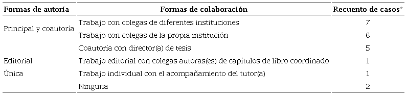 Si bien el presente estudio es exploratorio, hay suficientes evidencias para interpretar que un elemento clave de la escritura disciplinar para autoras(es) que se familiarizan con la publicación es la colaboración científica. La coautoría es la expresión formal de esta contribución, pero también reconocemos que otras expresiones pueden ser la lectura y la revisión de textos entre colegas antes de los procesos de dictaminación formales. Según los datos de este estudio, la coautoría en la publicación es una práctica descrita en casi todos los casos, excepto tres que informaron que contaban con un producto como autoras(es) únicos, cada uno. Además, todas(os) informaron haber sido autoras(es) principales (Tabla 3).