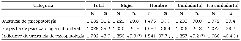 Los resultados del GHQ-12 evidenciaron la vulnerabilidad de la profesión docente a los problemas de salud mental, pues, como se observa en la Tabla 1, 68.8% de las personas encuestadas obtuvo más de 5 puntos en el instrumento, incluyendo 25.2% en la categoría que el Ministerio de Salud en Chile califica como de sospecha psicopatología subumbral y 43.6% en la categoría de indicativo de presencia de psicopatología. En esta última categoría, hay diferencias estadísticamente significativas que perjudican a las profesoras respecto de los profesores (45.3% y 37.7%; χ2, 2, N = 4,098, p < 0.001), así como a las personas cuidadoras con relación a quienes no cumplen ese rol (45.2% y 40.4%; χ2, 2, N = 4,109; p = 0.012).