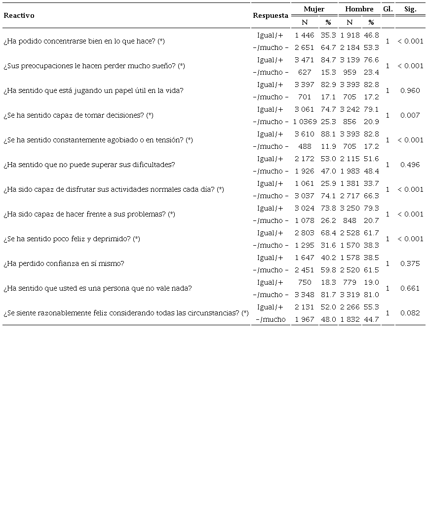 El detalle de las preguntas del instrumento (Tabla 2), traduce estos problemas de salud en las personas encuestadas en un sentimiento constante de agobio o tensión (86.9%), dificultades para conciliar el sueño (83.0%), disminución de la capacidad de disfrutar actividades cotidianas (72,4%), menor felicidad y depresión (67.0%) y problemas de concentración (62.2%). Al observar las diferencias por sexo, las docentes autorreportan más dificultades que los docentes en cada uno de estos ítems, pero tal vez el más interesante sea la dificultad para “concentrarse en lo que hace”, pues aquí la diferencia de resultados entre ambos es de 11.5%: mientras el 64.7% de las mujeres indica que puede concentrarse menos o mucho menos que lo habitual, el 53.3% de los hombres marca la misma respuesta.