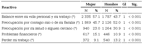 Al observar las diferencias por sexo y rol de cuidador(a), hay una tendencia encontrada en las otras preguntas que se reiteran aquí: siguiendo la repercusión en las relaciones personales, las educadoras y profesoras son quienes más reportan sufrir de un desbalance entre su vida personal y el trabajo (57.1% versus 43.7%). Sin embargo, ellas también indicaron mayores problemas financieros (15.1% versus 10.9%) que los docentes. En cambio, los hombres aparecen más preocupados por el contagio por COVID-19 (52.0% versus 45.7%) y la salud de alguien cercano (30.9% versus 23.0%), así como mayor temor a perder su trabajo (13.2% versus 9.1%) (Tabla 4).