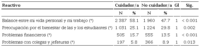 Ambos resultados obtenidos por las docentes se replican entre las y los cuidadores respecto de quienes no lo son (58.1% versus 47.7% y 15.7% versus 13.4%, respectivamente). Al observar a quienes desempeñan o no este rol en los demás reactivos, se encuentran también diferencias en la preocupación por el bienestar del estudiantado (29.8% versus 25.1%) y problemas con las y los colegas o jefaturas (8.9% versus 5.8%) que perjudican en mayor medida a las y los docentes que reportan no ser cuidadores(as) (Tabla 5).