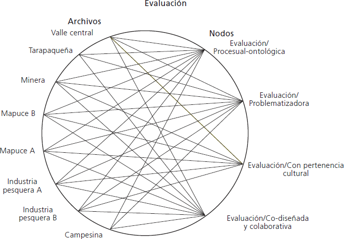 Los hallazgos son reveladores desde el punto de vista de las coincidencias encontradas en estas aulas. Así, los nodos que caracterizan la evaluación como procesual-ontológica, problematizadora y co-diseñada y colaborativa están presentes en los ocho casos, y la evaluación con pertinencia cultural se encuentra en siete, solo el aula tarapaqueña no revela esta condición.
