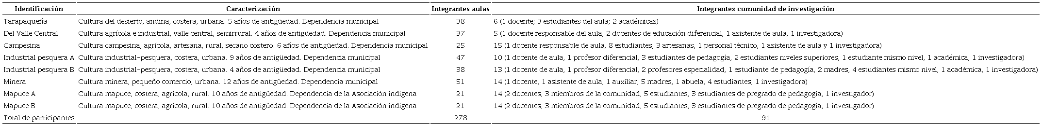 El estudio abarcó cinco regiones chilenas, ubicadas de norte a sur, a saber: Tarapacá, Metropolitana, Maule, Biobío y La Araucanía; cada una con atributos territoriales, geográficos, culturales, lingüísticos e históricos. Así, se conformaron ocho comunidades de investigación en ocho aulas comunitarias heterogéneas, en cuanto a la diversidad de participantes comunitarios (sabias(os), madres, padres, abuelas(os), artesanas) y educativos (docentes, escolares, estudiantes de pedagogía), así como a la diversidad de género, edad, escolarización, pertenencia cultural, asegurando la igualdad epistémica entre sus integrantes (Tabla 1).