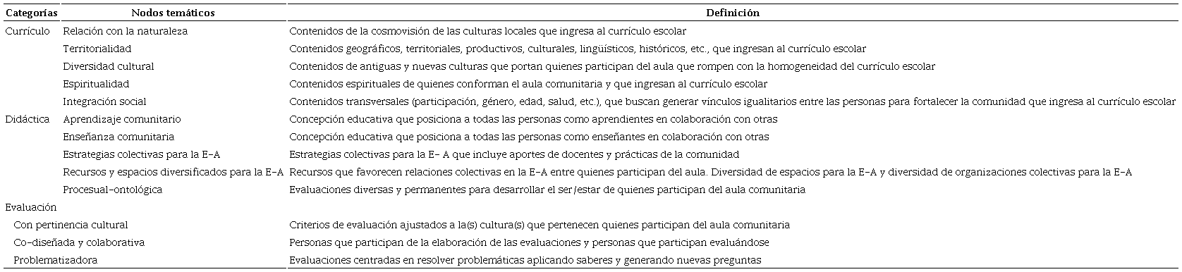 En primer lugar, las comunidades de investigación levantaron los nodos temáticos en torno a las categorías temáticas: currículo, didáctica y evaluación que consideraban propio de la pedagogía dialógica Enlazando Mundos (Tabla 2).