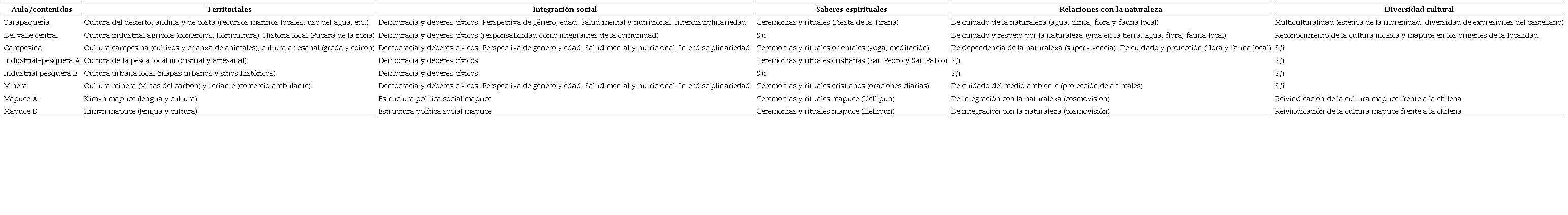Estos hallazgos van develando la especificidad de cada una de estas aulas. Es posible observar que respecto de los saberes territoriales se marca la identidad cultural de cada una de ellas, manifestando así la búsqueda de estas comunidades por legitimar sus saberes en el currículo escolar. Esto se ve fortalecido desde otras temáticas, tales como el ingreso de la espiritualidad como parte del currículo, donde se han detectado varias manifestaciones de ella (cristianas, orientales, mapuce). Algo similar ocurre con la diversidad cultural, que tiene enfoques diferenciados. En el aula tarapaqueña se aborda desde la multiculturalidad producida por la reciente inmigración de población latinoamericana; en cambio, en las aulas mapuce lo hacen desde la reivindicación de sus culturas ancestrales, con lo cual rompen con la visión monocultural y la rotan hacia una bicultural, cuestión expresada en el currículo propio de esta aula, cuya representación de la cultura mapuce alcanza el 50% del plan de estudio. Por su parte, la relación con la naturaleza adopta diferentes enfoques desde el respeto (valle central), cuidado (minera, tarapaqueña, campesina) y dependencia (campesina) hasta la integración con ella (aulas mapuce A y B). Así observamos, por una parte, una relación que aún sitúa a la humanidad desde fuera de la naturaleza (cosmovisión occidental) y, por otra, como parte integrante de ella (cosmovisión mapuce). Estos aspectos van profundizando la diferenciación de cada una de estas comunidades.