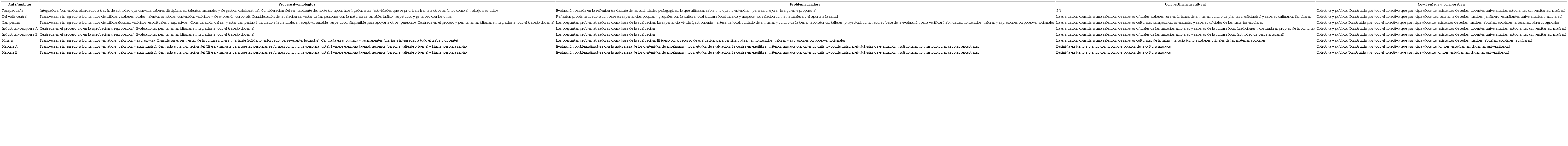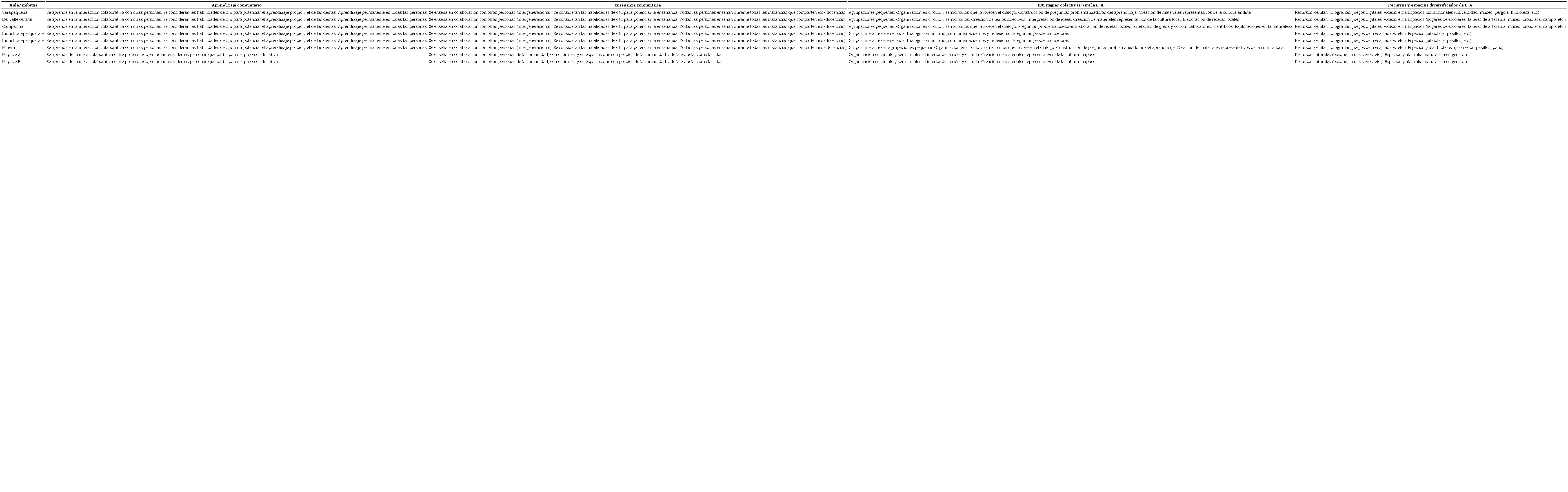 Los hallazgos revelan que, desde el punto de las concepciones educativas del proceso de la enseñanza y el aprendizaje, las ocho aulas adoptan didácticas comunitarias. Otros ámbitos de coincidencia que se observan en todas son la variedad de recursos que se crean para este proceso, la diversidad de espacios en los que se desarrolla el trabajo didáctico y el carácter colectivo que adoptan las estrategias para la E-A. Una profundización en cada uno de los ámbitos didácticos encontrados permite comprender las similitudes en las aulas, así como identificar algunas diferencias (Tabla 4).