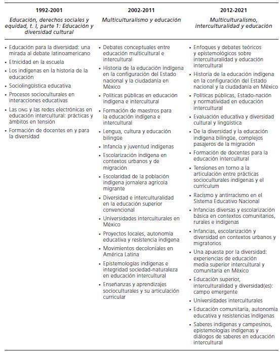 Como parte del Consejo Mexicano de Investigación Educativa, el área Multiculturalismo, interculturalidad y educación ha ido creciendo desde su primera inclusión en un estado de conocimiento, el que abarcaba la década de 1992 a 2002. Ello refleja la creciente relevancia que la atención a la diversidad cultural, lingüística y étnica está adquiriendo en las reivindicaciones de los movimientos sociales contemporáneos, así como en las respuestas generadas por las políticas públicas. Llama la atención que la clave para esta expansión de la investigación educativa sobre interculturalidad y diversidad no es de naturaleza intra-académica: consiste en las reivindicaciones y luchas de los pueblos originarios y de sus organizaciones por una educación cultural y lingüísticamente pertinente que esté arraigada en las realidades locales y regionales y que revierta el etnocidio cometido por la escuela castellanizadora y homogeneizadora. Estos reclamos están acompañados por iniciativas autónomas, proyectos-piloto no-gubernamentales en su mayoría, aunque a veces también desarrollados desde dentro de escuelas públicas; iniciativas y proyectos que a menudo no trascienden la escala local, pero que comienzan a generar redes alternativas y horizontales de colaboración e intercambio junto con las y los actores académicos y de formación docente que acompañan, analizan y apoyan estos procesos de “micro-interculturalización” educativa.