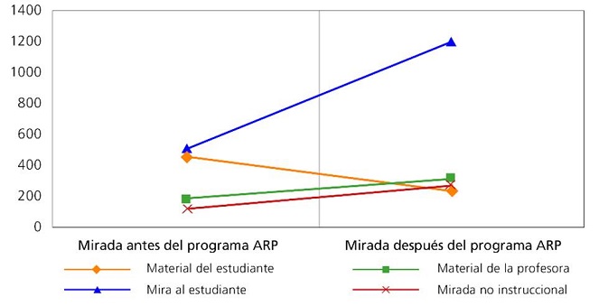 Los resultados muestran los cambios en el comportamiento de fijación de la mirada de las profesoras antes y después del programa En la medición post, dedicaron más tiempo en los intercambios verbales para mirar a sus estudiantes, tanto hombres como mujeres, en comparación con la medición previa.