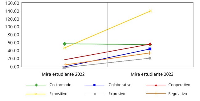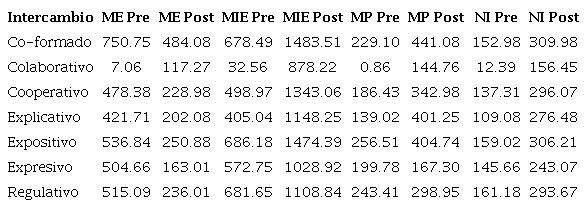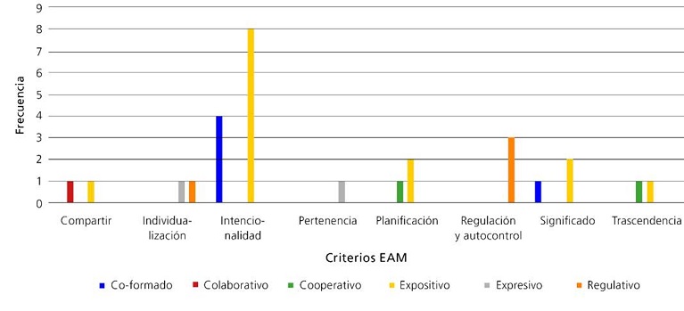Los intercambios expositivos y co-formados muestran una fuerte asociación con el criterio EAM universal intencionalidad. Por otro lado, el intercambio cooperativo está relacionado con el criterio diferenciador EAM de planificación y con el universal denominado trascendencia. El intercambio colaborativo se asocia con el criterio EAM diferenciador compartir; el regulativo está vinculado con el criterio diferenciador regulación y autocontrol; y el intercambio expresivo se relaciona con el criterio EAM diferenciador individualización.
