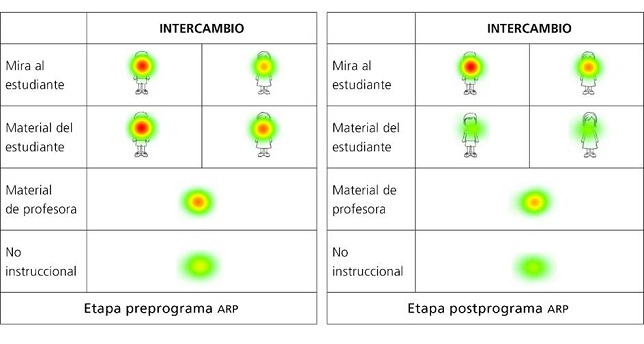 La mediana del tiempo de fijación de la mirada en los intercambios verbales mostró un cambio entre las mediciones pre y post del programa ARP. Se observó una disminución significativa en la fijación de la mirada hacia el material del estudiante (z = -2,197; p < 0.05). En contraste, se registró un aumento significativo en el tiempo de fijación de mirada hacia el Material de la profesora (z = 2,197; p <0.05), así como en la mirada no instruccional (z = 2,366; p < 0.05) y en la mirada al estudiante (z = 2,366; p < 0.05) (Figura 1).