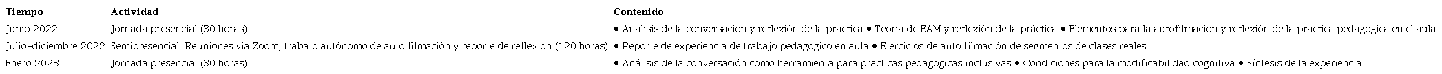 Programa de acompañamiento a la reflexión de la práctica pedagógica en la sala de clase (ARP). Se trata de un programa semipresencial de 180 horas, cuyo objetivo es retroalimentar la reflexión autónoma sobre la práctica pedagógica de las profesoras de educación básica. Lo anterior se logra a través de la autofilmación de clases y el reporte de experiencia de trabajo en aula realizada por las docentes durante el programa (Tabla 1).