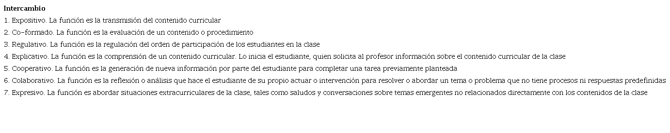 Para analizar la interacción en el aula a partir de los registros de clase, se codificaron los intercambios entre profesoras y estudiantes. En este contexto, un intercambio se define como la unidad mínima de la conversación que involucra al menos dos intervenciones de locutores diferentes: la profesora y el estudiante. Cada intercambio cumple diferentes funciones en la dinámica educativa (Tabla 2).