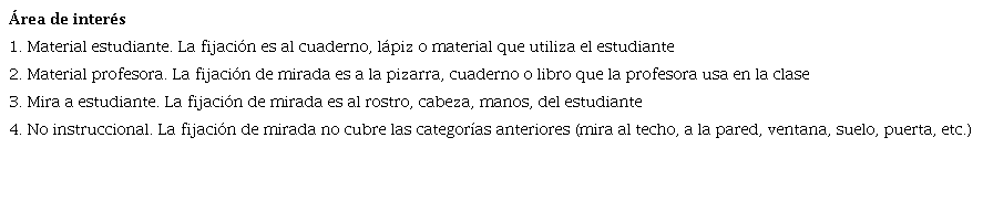 La codificación de los intercambios y los criterios de la teoría EAM se llevó a cabo utilizando el programa Videograph. Por otro lado, la codificación del comportamiento de la mirada de la profesora se realizó con Tobii Glasses Analyzer v. 1.36. En este contexto, las fijaciones de la mirada se definen como el tiempo que esta permanece en un área de interés (AI), establecido en un intervalo predeterminado de tiempo de 75 milisegundos. Las fijaciones se registraron en un mapa de AI estático, que se dividió en cuatro campos: mira al niño, mira su material, mira material del niño, no instruccional (Tabla 4). Este programa reporta las fijaciones en unidades de segundos y permite visualizar la duración de la mirada de la profesora en un área de interés específica mediante un mapa de calor; este utiliza una escala de colores que varía de baja densidad (amarillo), densidad media (verde) y alta densidad (rojo) en el AI.