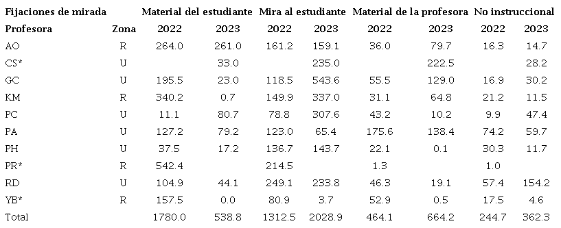 Se presentan los datos descriptivos de cada profesora participante según las mediciones del comportamiento de la mirada en las áreas de interés en el pre y post programa ARP (Tabla 5).