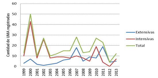 De los resultados de la fase I de aquel estudio destaca que las UMA intensivas (UMA-IN) representan más de las tres cuartas partes del total del registro nacional, en donde prevalece interés por el aprovechamiento sustentable (58.3%; obtención de ingreso por venta de productos), siendo el venado cola blanca la especie más frecuentemente registrada (24.7%). Los resultados para la región Sur-Sureste, en la cual se encuentra el estado de Yucatán, indican que fue la entidad federativa donde se registró mayor cancelación de UMA-IN durante el periodo de estudio de 1997-2000 (CONABIO, 2012).
