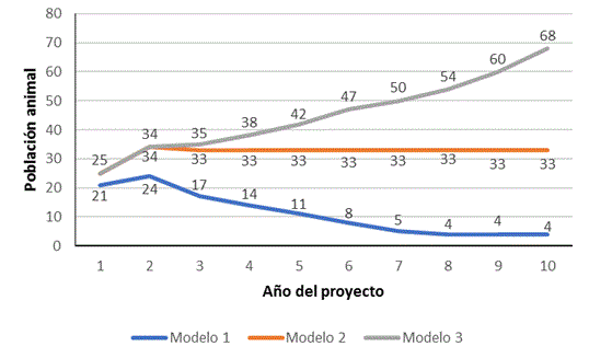 En la Figura 1 se describe la curva de crecimiento de la población animal por cada uno de los modelos desarrollados. Se evidencia un decrecimiento constante con el modelo 1, mientras que con el modelo 3 se aprecia un crecimiento constante, destacando la importancia del mejoramiento de los indicadores de producción para promover el crecimiento de la población animal. El modelo 2 fue previsto para mantener constante la población animal de acuerdo con la recomendación de capacidad de carga de las instalaciones, pero aun así para lograrlo, se requiere del mejoramiento de los indicadores productivos.