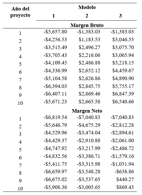 En la Cuadro 6, se presentan los resultados sobre margen bruto (MB) y neto (MN) anual para cada uno de los modelos desarrollados. El modelo 1 presenta valores negativos para MB y MN. Los modelos 1 y 2, desde el segundo año presentan valores positivos para MB, aunque únicamente en el modelo 3 se registra MN positivo a partir del año 9 del periodo de estudio. La TIR no se puede calcular pues los valores del MN son en su mayoría negativos. El VAN estimada para modelo 1, 2 y 3, es de -$21965.27, -$18345.19 y -$10955.89 USD, respectivamente.