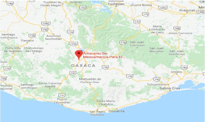 Amaranto de Mesoamérica S.C. de R.L., cabe resaltar, es estrategia del centro comunitario Centeotl A.C., en torno a este sistema productivo; que consiste en equipar a todas las localidades en donde se produce amaranto con trilladoras portátiles, limpiadoras de grano y tostadoras de amaranto, esto con el fin de que las familias produzcan amaranto con un valor agregado, promuevan la organización comunitaria y de esta manera generar el interés de adoptar el amaranto como cultivo básico, además de seguir ampliando su reproducción y su vitalidad para las futuras generaciones y por lo tanto su conservación como patrimonio cultural, información que fue proporcionada por el ing. Mario Enrique Rendón Gerente General Amaranto de Mesoamérica Vivir es una alegría, quien lleva 15 años laborando en la organización, indicando que Amaranto de Mesoamérica para el Mundo S.C. de R.L., es una empresa solidaria porque asesora el proceso de autoconsumo, la producción de excedente y valor agregado y se ubica en el Distrito de Zimatlán de Álvarez, Oaxaca, domicilio. Quintana Roo, San Antonio, 71,200 (Figura 1)