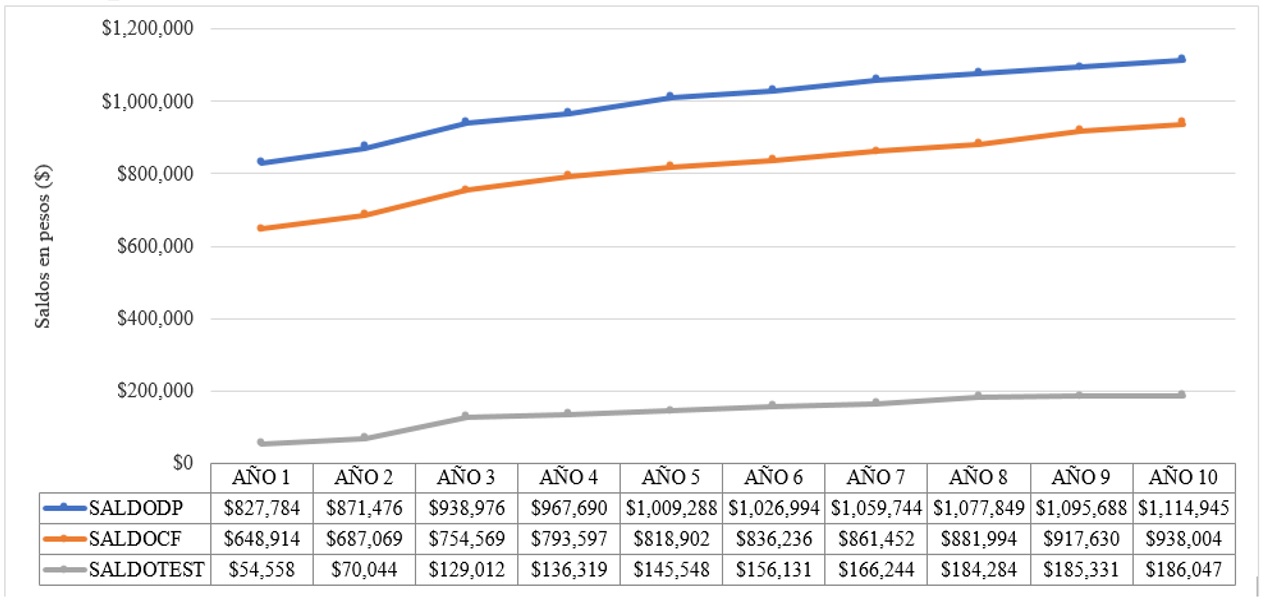 El tratamiento de CF presenta saldos positivos durante los 10 años de proyección (Figura 1). Durante los dos años iniciales también existe un desfasamiento de la producción originado por la falta de producción de crías y ausencia de reemplazos, que permitan la venta de vacas de desecho, originando que las ganancias sean relativamente bajas, en comparación con los siguientes años en donde las ganancias van de $818,902 pesos en el año cinco hasta $938,004 pesos en el año final de la proyección.