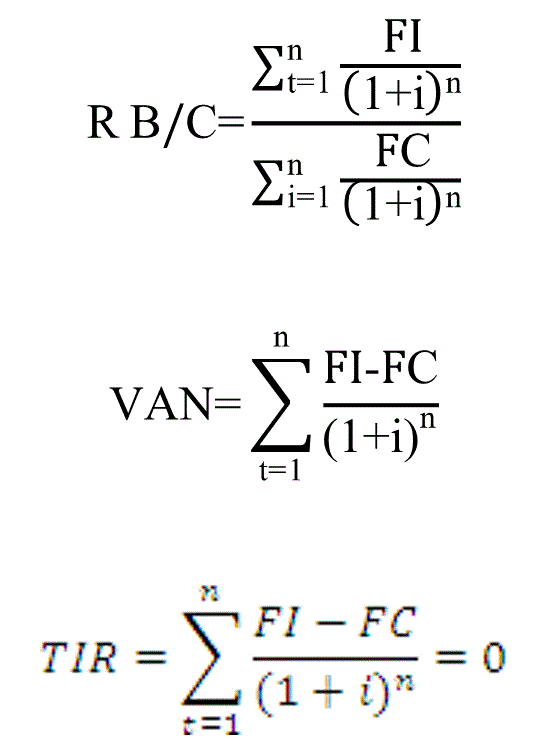 Una vez que se desarrollaron las funciones anteriores se aplicó el método de evaluación de proyectos de tipo agrícola a largo plazo propuesto por Gittinger, 1982; Coss, 1984) y se estimaron los tradicionales indicadores de rentabilidad que se usan para estas valoraciones: relación beneficio costo (RB/C), tasa interna de retorno (TIR) y valor actual neto (VAN), cuyas fórmulas matemáticas se presentan a continuación (Gómez, 1976; Moctezuma, 1977).