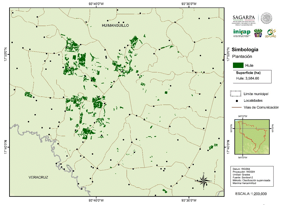 Los datos de SIAP, 2017 reportaron en 2016 una superficie sembrada en Tabasco de 4,320.04 ha, de las cuales en el municipio de Huimanguillo se encuentran 3,481.24 ha, superficie que representa 80.6% del estado que significa una fuerte concentración en la producción de látex, como se muestra en la Figura 2.