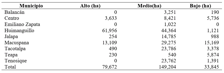 Del total de la superficie (262,721 ha) en el estado de Tabasco, el 56.8% corresponde al potencial medio y a nivel municipal, las mayores superficies se observan en Huimanguillo, ya que entre los tres niveles su potencial es de 107,441 ha, que representan 40.9% a nivel estatal, el segundo lugar municipal lo ocupa Macuspana que abarca 57,553 ha que significa 21.9% de la entidad y el tercer municipio es Tacotalpa con 10.5%.