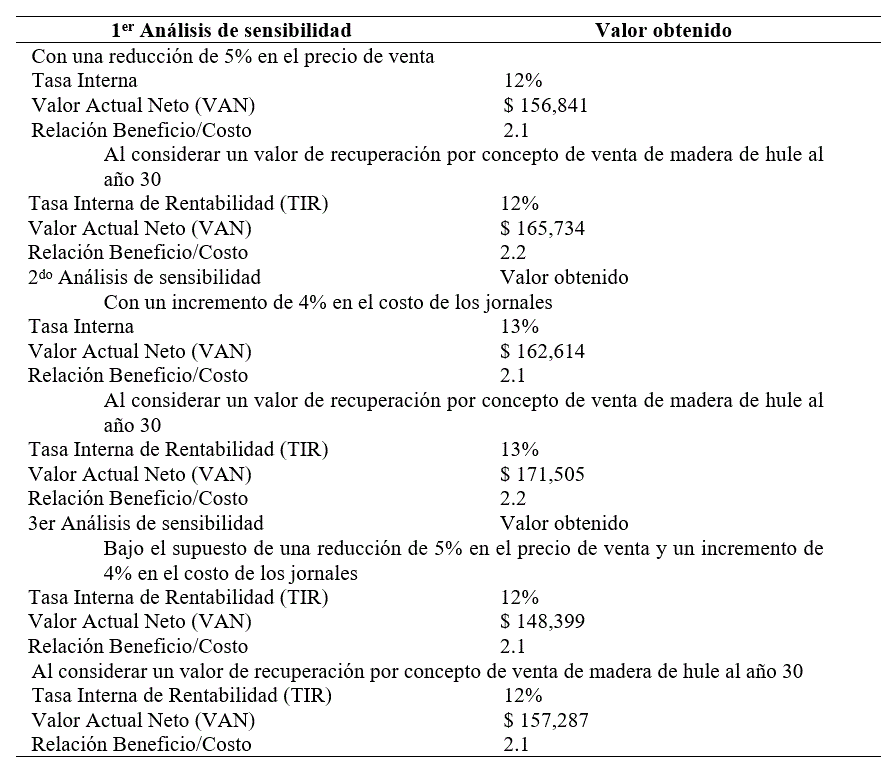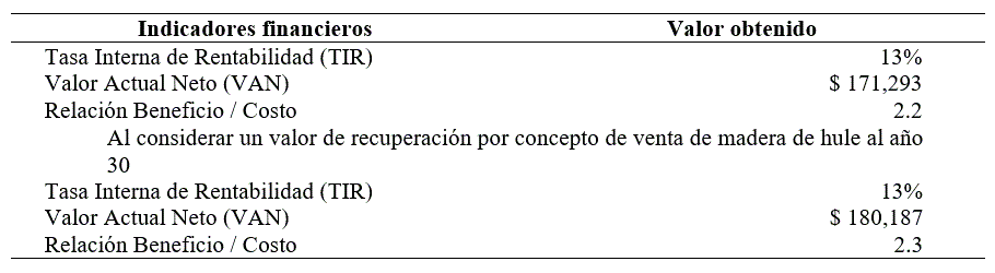 El análisis económico que se realizó permitió hacer la estimación de los indicadores TIR, VAN y RB/C que facilitan a productores y agroindustriales, la toma de decisiones de llevar a cabo el establecimiento de plantaciones de hule. Los resultados se presentan en el Cuadro 2.
