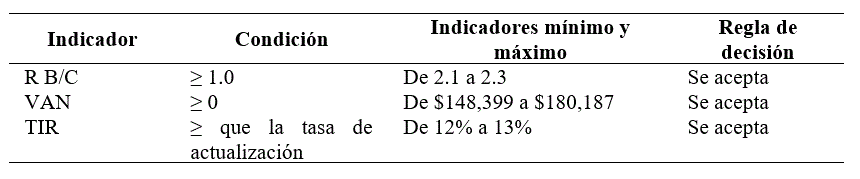 Todos los análisis de sensibilidad fueron positivos con valores mínimos en el VAN de $148,399, TIR de 12% y RB/C de 2.1 y con máximos en el VAN de $171,505, TIR de 13% y RB/C de 2.2. De aquí se desprende que todas las opciones cumplen con la regla de decisión económica para que se acepten dentro de la metodología de evaluación de proyectos como se observa en el Cuadro 4.
