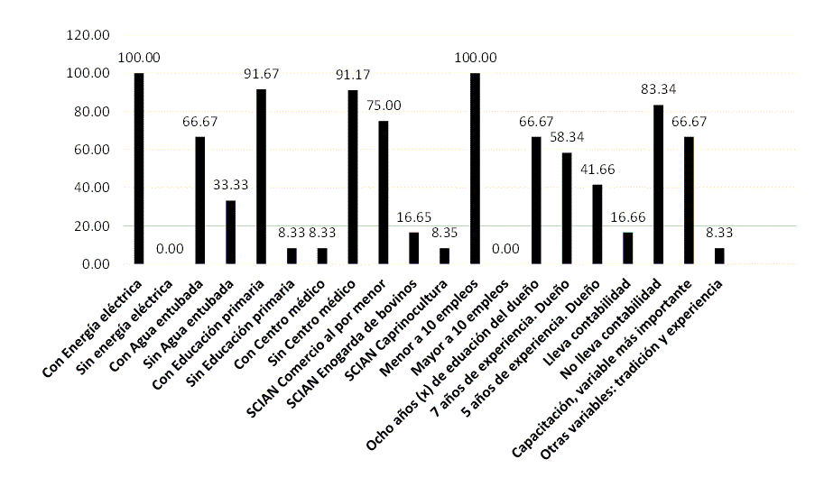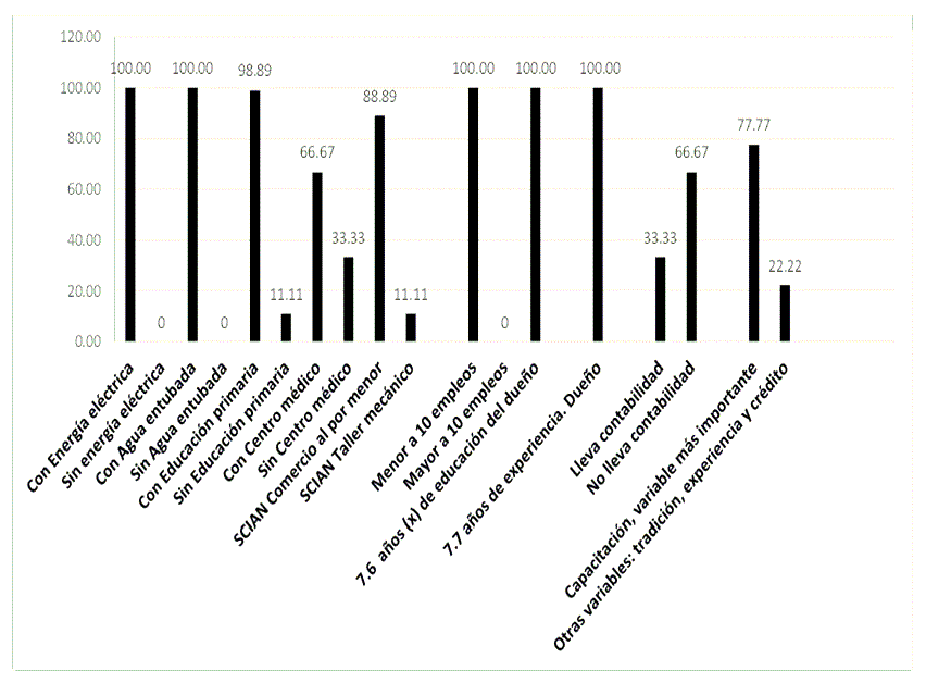 En microempresas, en las comunidades rurales del municipio de San Pedro del Gallo se encontró que: en el 100.00% de ellas laboran menos de 10 (diez) personas por lo que, de acuerdo con la SE-SHCP (2013), sin importar a que sector pertenecen, se clasifican como microempresas. Además, no ofrecen empleos temporales; sus dueños poseen 7.6 años de educación formal por lo que apenas superan la educación primaria; la experiencia en el negocio es de 7.7 años en promedio; sólo el 33.33% llevan contabilidad y lo hacen en un simple cuaderno, pero, la gran mayoría no la lleva (66.67%). Los que no la llevan, el 22.22% es por no saber cómo se lleva, el 11.11% por que la cree innecesaria y un 66.67% no contestó y; para el 77.77% las variables más importantes en la implementación y permanencia de las microempresas y en orden de importancia es la capacitación sola o mezclada con experiencia y crédito mientras que para el restante 22.22% son: experiencia, tradición familiar y disponibilidad de crédito, en ese orden (Cuadro 1 y Figura 1).