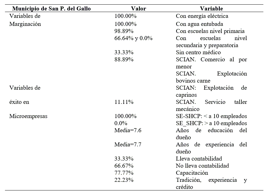 En marginación, para las comunidades rurales del municipio de San Pedro del Gallo se encontró que: El 100.00% cuenta con energía eléctrica; el 100.00% cuenta con agua entubada; el 88.89% cuenta con escuelas de educación primaria-SEP y sólo el 11.11% no cuenta con ella. A nivel secundaria, cuenta con ella el 66.64%. Desafortunadamente y aunque el cuestionario fue aplicado, en ambos municipios, a comunidades mayores a 50 y menores a 2500 habitantes, ninguna comunidad donde se aplicó el cuestionario cuenta con el nivel de preparatoria por lo que tienen que ir a otras comunidades, generalmente a San Pedro del Gallo. Ello es menos drástico de lo que señalan CONAPO (2016) y CONAPO (2017), el primero: “La escolaridad es otro problema que viven las microempresas ya que ahí se desarrollan sin escolaridad el 4%, con educación básica el 52%, con educación media el 30% y con educación superior el 15%” y el segundo: “ambos municipios, en el 2015, tenían un índice de marginación bajo, lo que indica que ambos municipios tenían bajas carencias al acceso a los servicios como educación, salud, agua entubada, ingresos y otros” El 55.56% de las comunidades cuenta con carretera principal pavimentada y el resto, 44.44%, la carretera es de terracería y de ellas, sólo el 33.34% están en buenas condiciones y el 11.11% en malas condiciones físicas; el 66.67% cuenta con clínica o centro médico y el 33.33% no cuenta con ello. De las clínicas o centro médicos existentes, el 66.67% cuenta con mobiliario y equipo básico, el