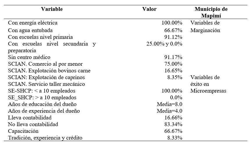 Para el municipio de Mapimí, el universo de microempresas fue de 30, la muestra estimada fueron 11 (once) microempresas de sus comunidades rurales (con población igual o mayor a 50 habitantes y menor a 2,500 habitantes) aunque la muestra estudiada fueron 12 (doce) encuestas al mismo número de microempresas ello con el propósito de incrementar el nivel de seguridad. Como referencia para este municipio, la ubicación geográfica de dos de las microempresas estudiadas es: Montes de Oca: 25051'48" Latitud Norte y -103035'23" Latitud Oeste y Roma Texas: 25052'4" Latitud Norte y -103043'39" Latitud Oeste. En el municipio de San Pedro del Gallo, el universo de microempresas fue de 14, la muestra estimada fueron 8 (ocho) microempresas de las comunidades rurales (con población igual o mayor a 50 habitantes y menor a 2,500 habitantes) aunque la muestra estudiada fueron 9 (nueve) encuestas al mismo número de microempresas ello con el propósito de incrementar el nivel de seguridad. Como referencia, para este municipio, la ubicación geográfica de tres de las microempresas estudiadas es: Santo Domingo: 25049'11” Latitud Norte y -104026'31" Latitud Oeste, El Casco 1: 25032'48" Latitud Norte y -104035'18" Latitud Oeste, El Casco 2: 25032'47" LN y -104035'18" LW y Cuba; 25032'27" Latitud Norte y -104029'53" Latitud Oeste. Ambas comunidades y municipios están ubicados en el estado de Durango, México (INEGI, 2015a).