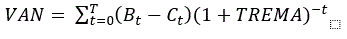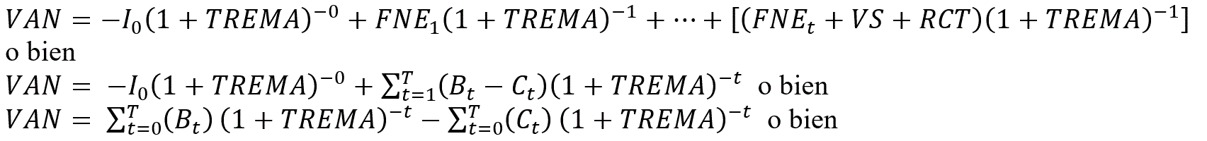 El VAN puede definirse como el valor actual o presente de los flujos de efectivo netos de una propuesta de inversión (Mete, 2014), o simplemente como un indicador que mide el valor económico creado (Marchioni y Magni, 2018). Este indicador representa la ganancia acumulada neta que generará el proyecto durante un periodo determinado y sus resultados se expresan en unidades monetarias en el año cero del proyecto (Walter, 2011). El VAN parte del supuesto que una determinada suma de dinero tiene mayor valor en el presente que, en el futuro, debido al efecto que tiene la inflación sobre el poder adquisitivo y se caracteriza por tener una relación inversa con la TA o TREMA, si la TA se incrementa disminuye el VAN y viceversa.