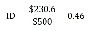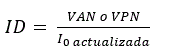 El ID expresa el monto de beneficios (B) que arroja un proyecto, después de haber pagado la inversión (I0) por peso invertido. El criterio de aceptación de un proyecto con base en este indicador es, si el ID ³ 0, el proyecto debe aceptarse. El resultado del ID puede interpretarse como: “durante el horizonte del proyecto, a una TREMA de 10%, el proyecto paga toda la inversión y genera una ganancia de 46 centavos por cada peso invertido”.