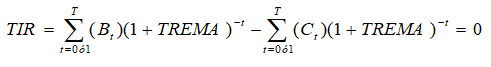 El indicador TIR se puede definir como la tasa de actualización que reduce a cero el VAN (Papendiek et al., 2016), o como aquella tasa que hace que el valor actualizado de la corriente de beneficios se iguale al valor actualizado de la corriente de costos. De otra manera, se puede entender como la TA que permite al valor actualizado del Flujo de Fondos (FF) o beneficios incrementales netos (BIN) igualarse a cero (Glover et al., 2014), y se considera después del VAN como una de las métricas más utilizadas para aceptar o rechazar un proyecto (Hurley et al., 2017).