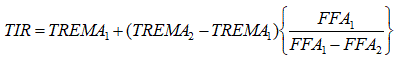 Una consideración importante que debe tomarse en cuenta por el analista financiero antes de estimar la TIR, es que su cálculo sólo puede realizarse cuando el FF (flujo de fondos) presenta por lo menos un valor negativo en los años iniciales del proyecto. Si todos los valores son positivos, entonces ninguna TA podrá hacer que el valor del FF se iguale a cero. En su forma tradicional, la TIR se calcula por tanteo o interpolación, al buscar tasas de actualización que igualen a cero el FFA. Este procedimiento se basa en obtener dos FFA (La tasa de actualización que se acerca a cero, la corriente del FFA es precisamente, I2 = Tasa de Actualización 2) que más se acerquen a cero, con la condición de que uno debe ser positivo y el otro negativo, y la diferencia entre las TA utilizadas para obtener el FFA sea de cinco puntos porcentuales como máximo, con el objeto de que el resultado tenga un mínimo de error. Al obtener las dos TA puede realizarse la interpolación aplicando la fórmula ocho. La TIR interpolada, ofrece un resultado superior al del verdadero rendimiento; lo cual se debe a que la técnica lineal de interpolación parte del supuesto implícito de que, a medida que se pasa de una TA a otra, la TIR cambia siguiendo una función curvilínea cóncava, el error introducido es pequeño y desaparece cuando el resultado se redondea al punto porcentual más próximo.