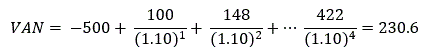 VAN = - 500.0 + 90.9 + 122.3 + 229.2 + 288.2 = 230.60