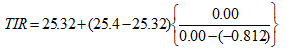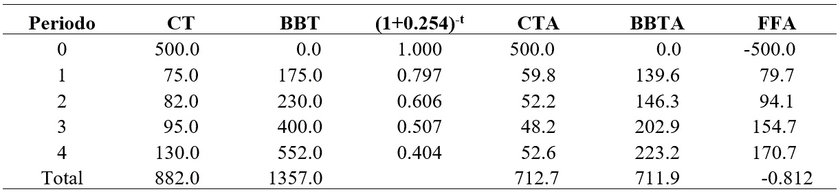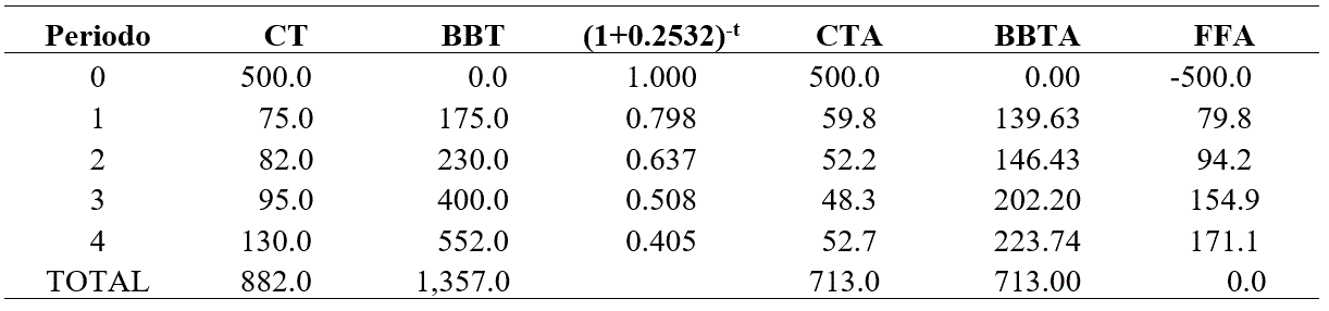 La TA o la TREMA que permite calcular la TIR, es aquella con la que se obtiene un segundo FFA negativo pero lo más cercano a cero; tal tasa es 25.3%. En el Cuadro 4, se presenta la información de costos y beneficios actualizados a la tasa anterior. Se puede observar que se obtiene un VAN negativo, y con la tasa estimada se pondera el cálculo de la TIR para obtener su valor respectivo. Esto es: