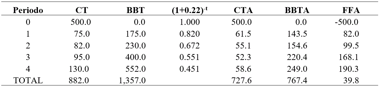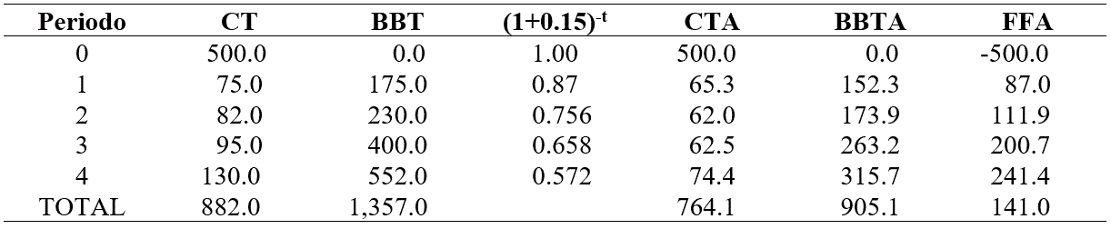 Es el número de periodos necesarios que requiere un proyecto, para recuperar la inversión inicial (Ramírez et al., 2017). Su cálculo puede realizarse sobre los valores actualizados o sin actualizar. Sin embargo, dado que los análisis se realizan sobre la base de la TA, entonces el PR (Cuadro 9) para el ejemplo hipotético se calculará utilizando los datos actualizados.