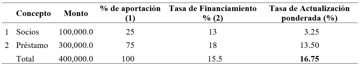 La TA ponderada que se utiliza para evaluar el proyecto es 16.75%. El procedimiento para su obtención consiste en determinar el porcentaje de aportación que tienen sobre el capital total los socios y las instituciones donde se solicitó el préstamo, la cantidad o monto en dinero que aportará cada uno de ellos se divide entre el monto total de la inversión y se multiplica por cien. Posteriormente cada porcentaje de aportación (1) se multiplica por la tasa de financiamiento (2) y luego se suma cada producto para obtener la TA. En esta estimación no se recomienda utilizar el promedio de la tasa de financiamiento como TA debido a que este procedimiento presenta error de estimación, observe porqué: al multiplicar 13% por $100,000.0 y 18% por $300,000.0 el resultado es $67,000.0 (pesos mexicanos); sin embargo, al multiplicar la tasa promedio del financiamiento (13%+18%)/2 = 15.5%; por $400,000.0, el resultado es $62,000.0, el cual difiere de los $67,000.0 obtenidos mediante la ponderación de la TA. Este procedimiento puede comprobarse porque al multiplicar la TREMA estimada 16.75% por el monto total del financiamiento ($400,000.0) el resultado es $67,000.0, lo cual confirma el hecho de que no debe utilizarse el promedio de la tasa de financiamiento como TA ponderada debido a que este procedimiento subestima el valor del monto total de la inversión.