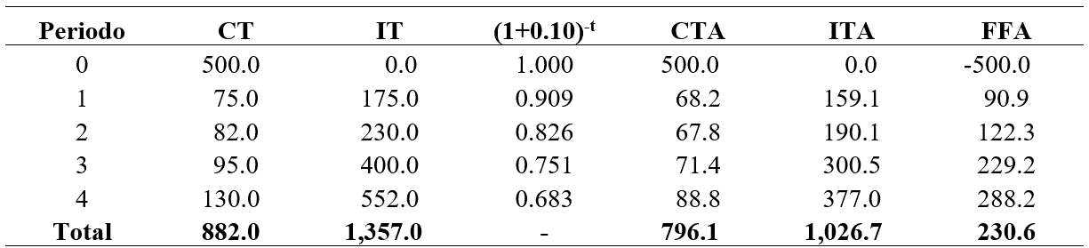 La interpretación del VAN puede realizarse de la siguiente manera: “durante el horizonte del proyecto con una Tasa de Descuento de 10%, se obtendrá una utilidad neta de 230.6 pesos mexicanos”. El CTA e ITA se obtienen al realizar dos pasos; en el primero se calculan los valores de la TA durante la vida útil del proyecto, procedimiento, que se realiza elevando la TA a la potencia del año que se requiera actualizar; por ejemplo, (1.10) ^-0 = 1.0…. (1.10) ^-4 = 0.683 y en el segundo se multiplica el costo e ingreso total por los valores actualizados estimados en el primer paso; esto es, 130 * 0.683 = 88.8, con ello, se puede obtener el FFA para cada año restando al ITA el CTA.
