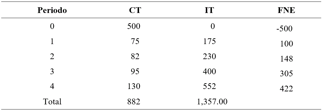 Para observar este comportamiento y el de los restantes indicadores tradicionales y complementarios de rentabilidad en el Cuadro 2, se presenta el análisis de un proyecto hipotético considerando información de egresos totales (ET) e ingresos totales (IT) que se obtendrán año con año durante la vida útil del proyecto. Adicionalmente como propuesta para realizar este ejercicio hipotético la TA utilizada fue 10%. Sin embargo, los lectores hasta este punto tienen ya el conocimiento de cómo estimar una TA bajo diferentes escenarios con y sin financiamiento.
