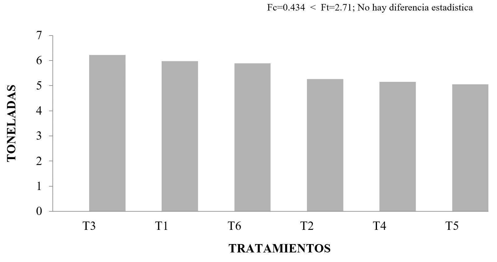 Como se puede observar en la Figura 1, los tratamientos con mayor producción de forraje verde en toneladas por hectárea fueron: el T3 con 6.2 toneladas (inorgánico), el T1 con 5.9 toneladas (orgánico) y el T6 con 5.8 toneladas (testigo). En el análisis estadístico Fc < Ft; que significa que no hubo diferencia estadística entre los tratamientos.