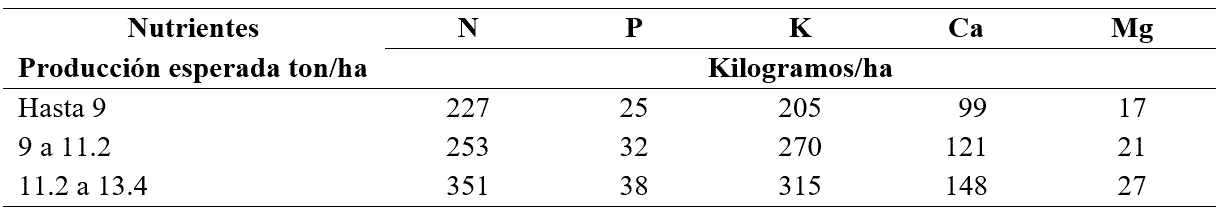 La alfalfa se utiliza principalmente para la alimentación del ganado bovino lechero y para la elaboración de alimentos concentrados para aves, caballos y cerdos, debido a su alta producción y excelente calidad forrajera; pues en éste cultivo se tienen las ventajas de alta productividad de forraje al año, alta calidad de nutrientes, excelente aceptación por parte del ganado, facilidad de manejo, fija grandes cantidades de nitrógeno atmosférico; y con ello mejora la estructura del suelo ayudando a mejorar la aireación y el drenaje agrícola (Barrera-Melgoza, 2005). Pero a pesar de ser un fijador de nitrógeno atmosférico, la alfalfa requiere una serie de macroelementos de acuerdo con la producción de forraje por hectárea tal como lo indica el Cuadro 1.