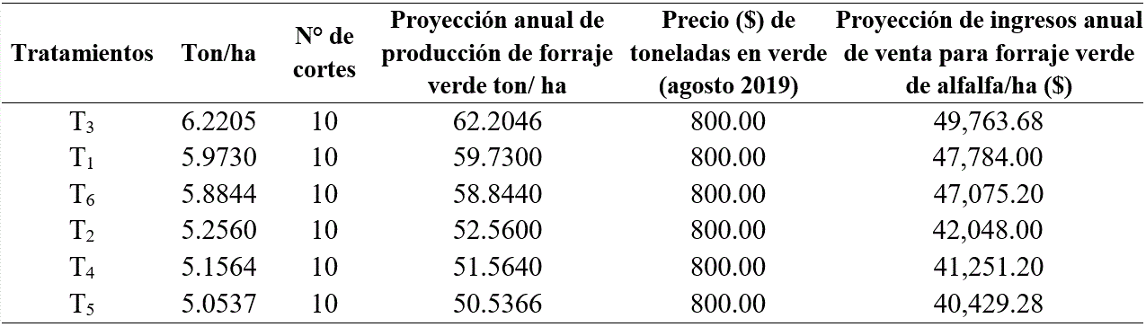 En el Cuadro 2 se puede observar una comparación de los ingresos proyectados de la venta de alfalfa en verde a 10 cortes con un precio de venta de $800.00 pesos/tonelada. Se puede apreciar que las diferencias monetarias entre los T3 y T1 son de casi $2,000.00 pesos, y entre fertilizar con fuente orgánica (T1) y no fertilizar (T6) es de escasos $709.00 pesos.