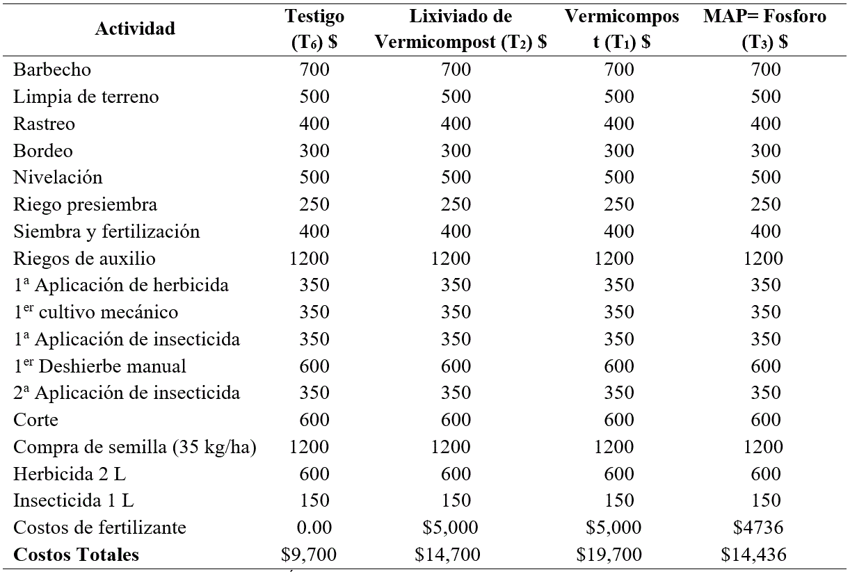 Relacionado con los costes estimados por hectárea para producir alfalfa la Cuadro 3 permite observar como el T6 es el que menos inversión tiene con menos de $10,000.00 pesos/ha y el de mayor inversión es el T1 (orgánico) con $19,700.00 pesos por ha, mientras que T3 (inorgánico) presenta costes de $14,436.00/ha.
