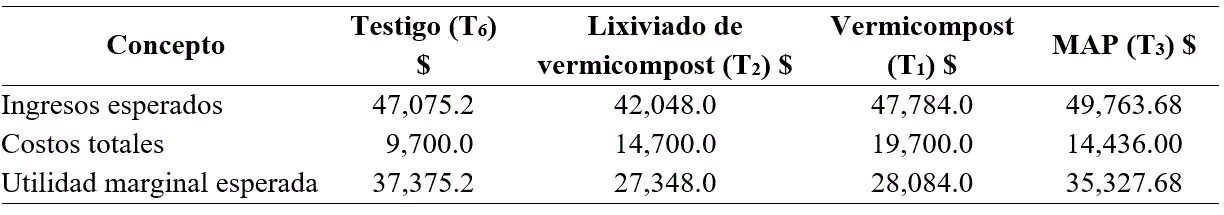 La utilidad marginal esperada se puede apreciar en el Cuadro 4. En ella se puede observar que la utilidad para el tratamiento 1 es de $28,084 pesos/ha y el de mayor utilidad es el testigo con $37,375.00 pesos/ha. En el Cuadro 4 se permite visualizar dos fertilizantes orgánicos (T1 y T2), un fertilizante inorgánico (T3) y el comportamiento del testigo (T6).