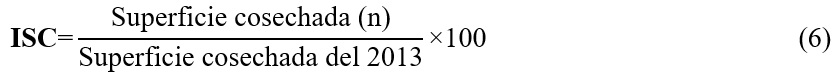 Finalmente se calculó el índice de rendimiento por hectárea, dividiendo el valor de la producción por hectárea cosechada a precios contantes de un año cualquiera, entre el valor de producción por hectárea cosechada a precios constantes correspondientes al 2013 o año base, multiplicándolo por 100 para hacerlo índice: