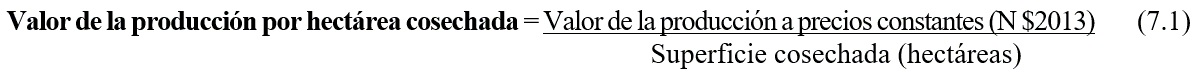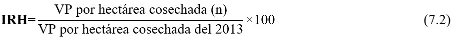 VP por hectárea cosechada del 2013: Valor de la producción por hectárea cosechada a precios constantes correspondiente al año del 2013 (año base).