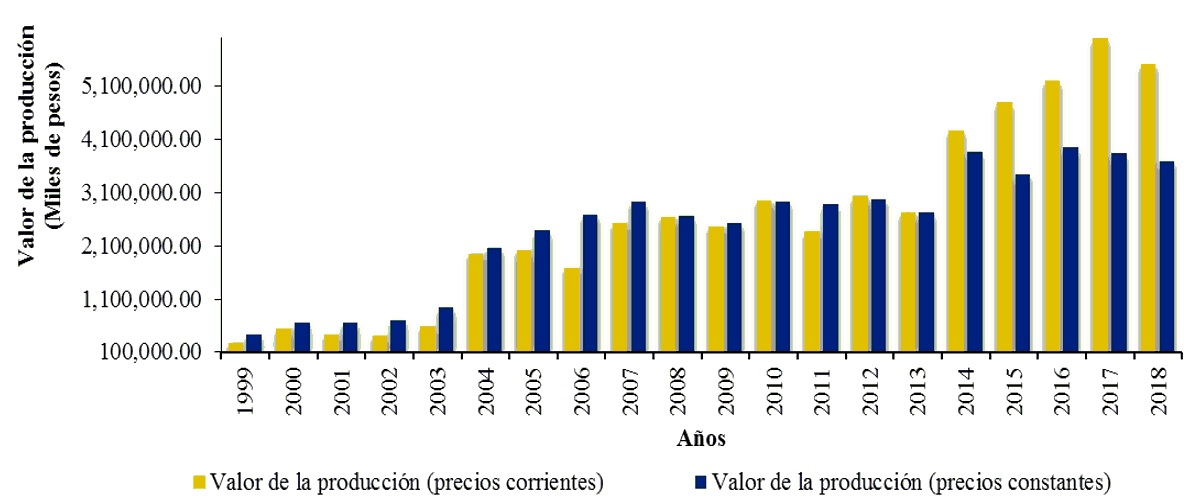En 2004 el valor de la producción de $ 2,068,108.8 a precios constantes se incrementa y pasa a $ 2,385,829.1 en 2005, teniendo un repunte en el 2014, con $ 4,274,269.9 (valor corriente) y $ 3,863,762.6 (valor constante) siguiendo la misma tendencia hasta el final del período.