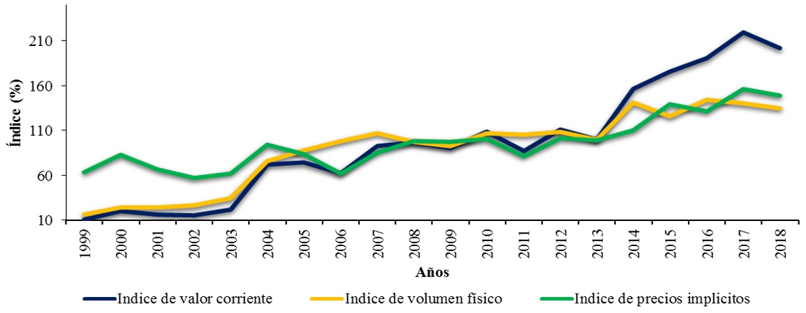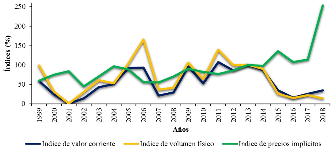 En la Figura 2, se puede observar que durante el período de análisis tanto el índice de precios implícitos como el índice de valor corriente disminuyeron debido al incremento del volumen físico. Sin embrago, a partir del 2007, se observó un comportamiento similar para los tres indicadores, con un repunte en 2014 del índice de valor corriente de la producción de chile jalapeño a nivel nacional, ocasionado por el incremento del precio principalmente, ya que del 2014 a 2018 el preció aumentó en un 73.0%, mientras que el incremento de la producción creció solo un 25.9%.